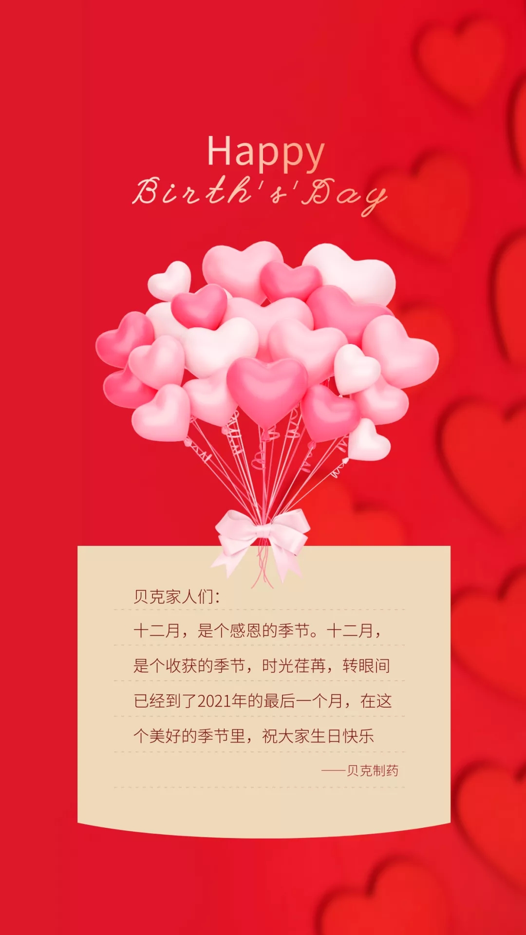 “以人為本”是一個(gè)現(xiàn)代企業(yè)文化的核心競(jìng)爭(zhēng)力,優(yōu)秀的企業(yè)應(yīng)該具有內(nèi)涵豐富、底蘊(yùn)深厚的企業(yè)文化。貝克制藥每月舉辦的生日會(huì)就是體現(xiàn)公司人文關(guān)懷的一種舉措,相信通過這個(gè)有意義的活動(dòng),可以讓每一個(gè)貝克人都能感受到公司的深情關(guān)懷,感受到這個(gè)集體的溫暖和幸福。精美的賀卡和生日福利卡是公司送給大家最真摯的祝福、最貼心的關(guān)懷。