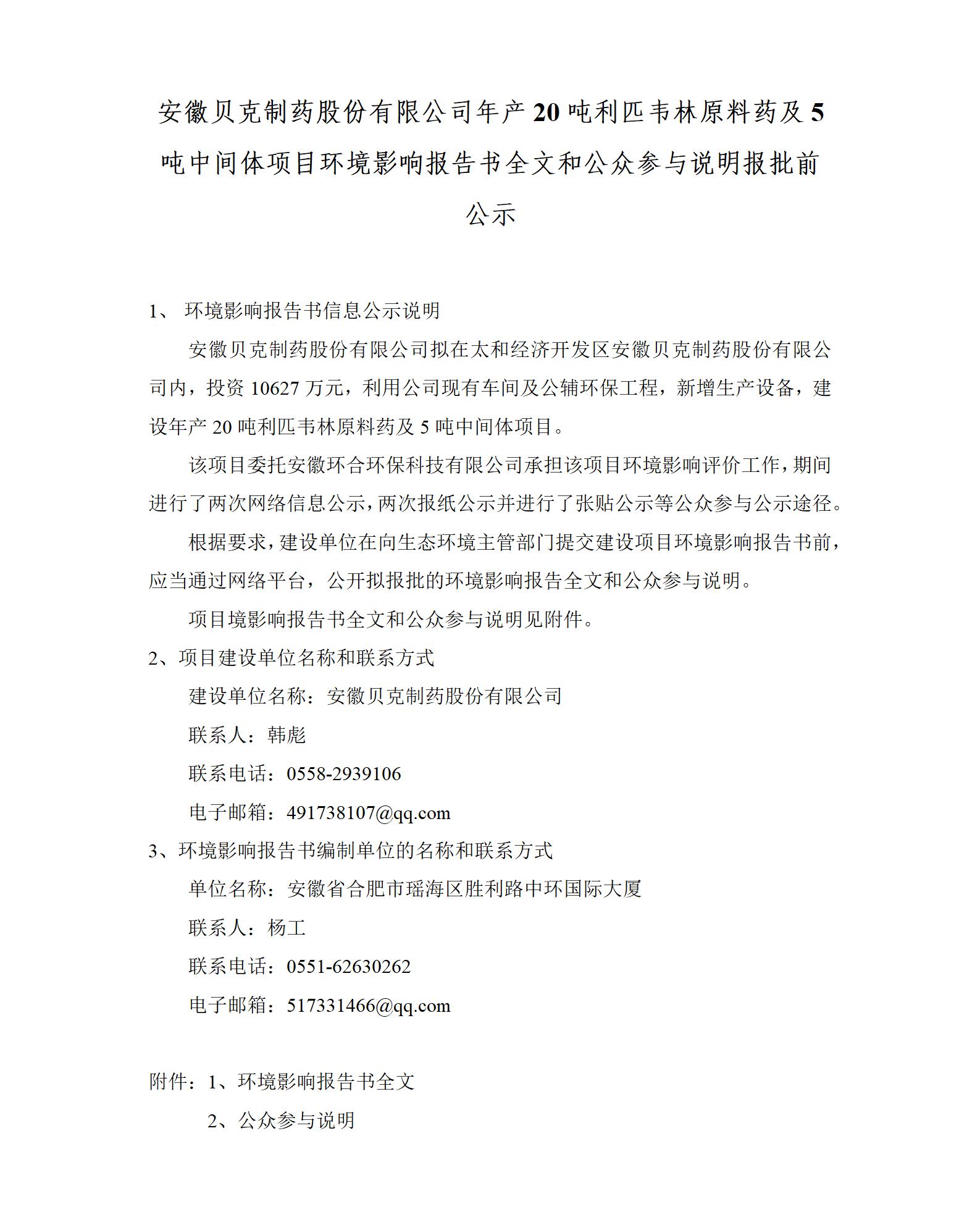 年產(chǎn)20噸利匹韋林原料藥及5噸中間體項目環(huán)境影響報告書全文和公眾參與說明報批前公示